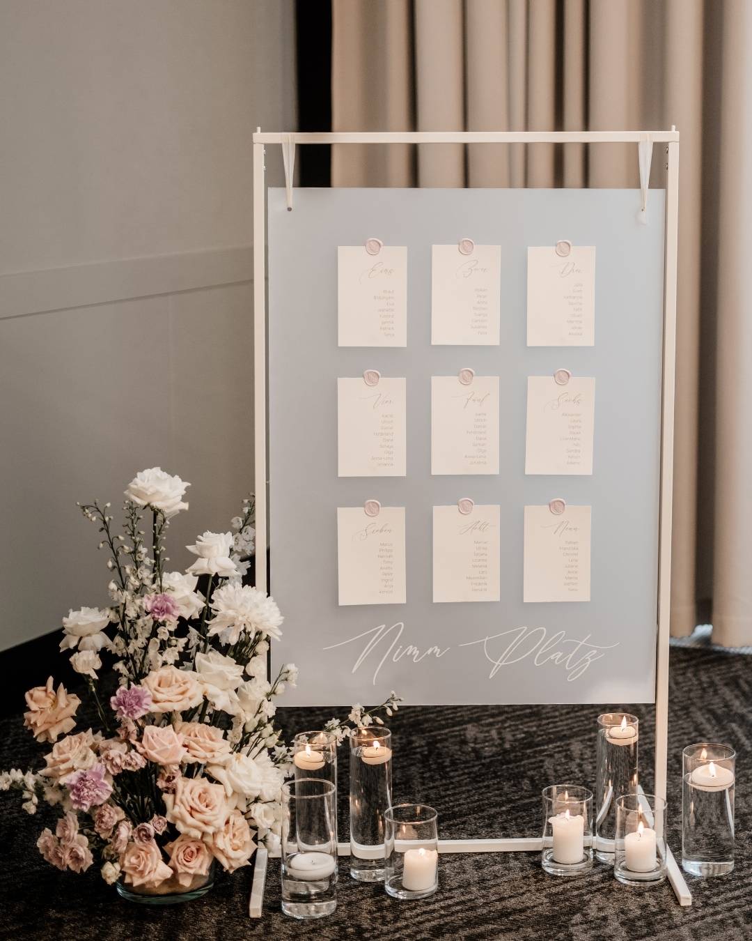 Unser Schildständer bietet euch die Möglichkeit Schilder, Bilder, Wegweiser, etc. frei zu platzieren. Mit entsprechenden Schlaufen könnt ihr eure Schilder einhängen. Der moderne Stil lässt sich wunderbar an euer Dekokonzept anpassen. Mit passender Floristik und dezenter Bodendekoration wie z.B. einer Weinkiste oder Laterne bietet solch ein Setting bereits feierliche Stimmung.